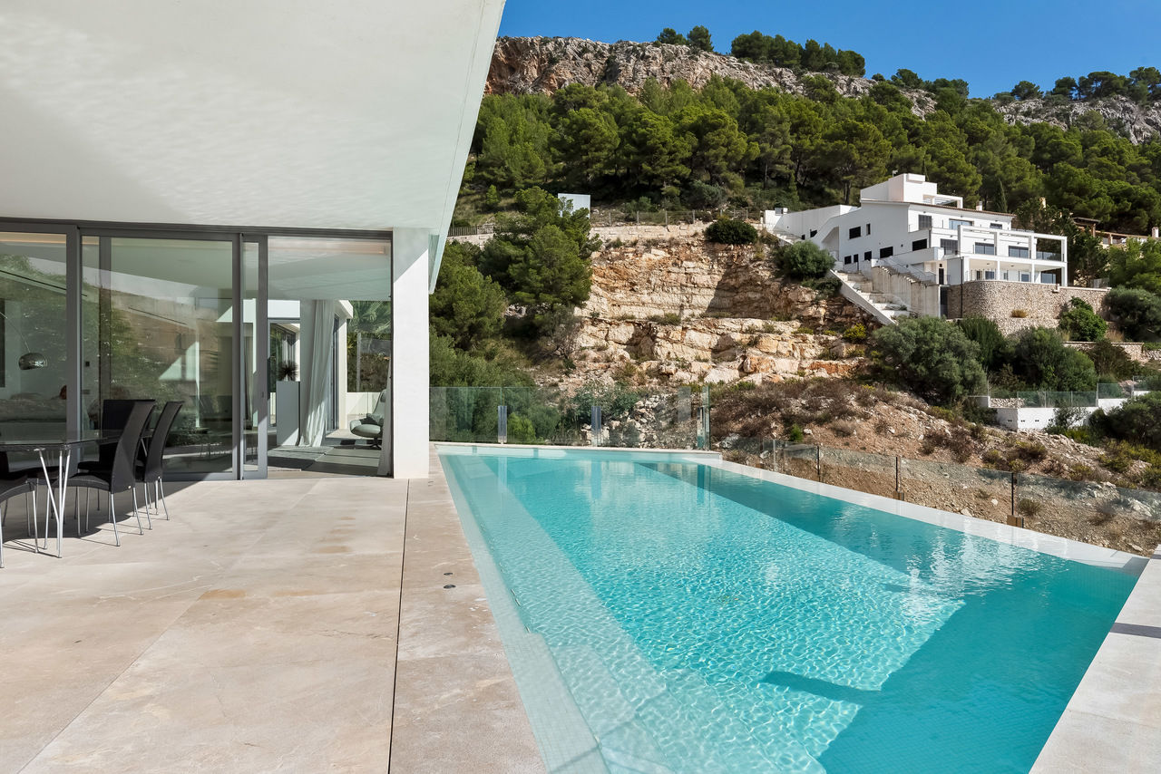 Die bebaute Fläche der Villa von ca. 803 m2 ist auf 3 Ebenen aufgeteilt: Insgesamt 4 Schlafzimmer, 5 Bäder, 1 separates Gäste-WC, ein offener und grosser Wohnbereich, ein separates Esszimmer und eine voll ausgestattete Designer-Küche. Auf der unteren Etage gibt es ein Kino und einen Fitnessraum. Alle Zimmer verfügen über eine Terrasse. Der grosse Salzwasser Infinity-Pool mit ca. 50 m2 sorgt für eine willkommene Erfrischung an heissen Tagen. Hier kann man auch sportlich seine Bahnen ziehen.