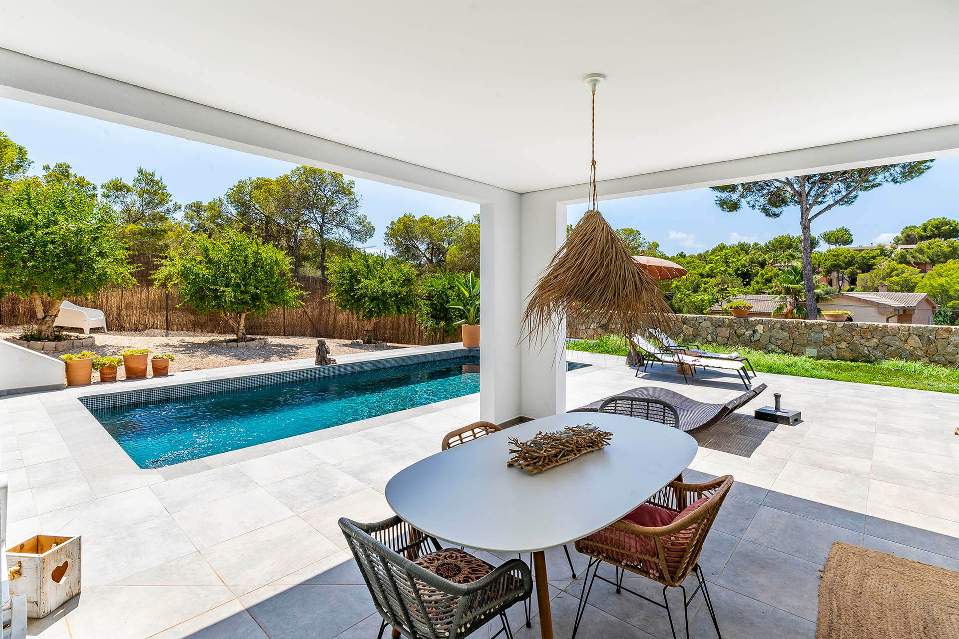 Diese moderne Villa mit Pool in Cala Vinyas auf einem ca. 1.450m2 grossen Grundstück bietet viel Platz und Privatsphäre. Die bebaute Fläche von ca. 270m2 verteilt sich auf einer Ebene auf einen grossen und hellen Wohn-Essraum mit einer angrenzenden offenen Küche, die voll ausgestattet ist und über eine Kochinsel verfügt, 4 Doppelschlafzimmer mit Einbauschränken, 2 Bäder, einen Hauswirtschaftsraum mit Waschmaschine und Trockner ausgestattet und einen Abstellraum. Die Fussböden sind mit hochwertigen Fliesen ausgestattet, die Fenster sind doppelt verglast und es gibt eine Vorinstallation für eine Klimaanlage, Heizung und einen Kamin. Im Garten liegt der Swimmingpool und es gibt eine weitläufige Fläche an Terrassen und eine grosse überdachte Terrasse. Eine automatische Bewässerungsanlage ist vorhanden. Die Garage bietet Platz für 2 PKW.