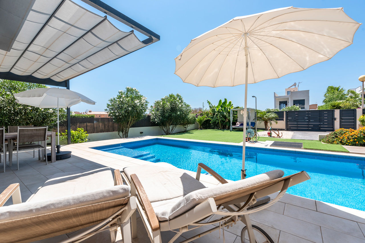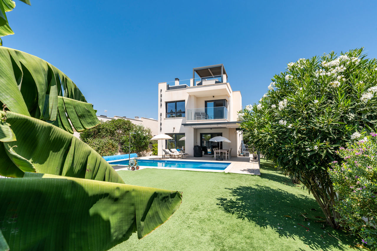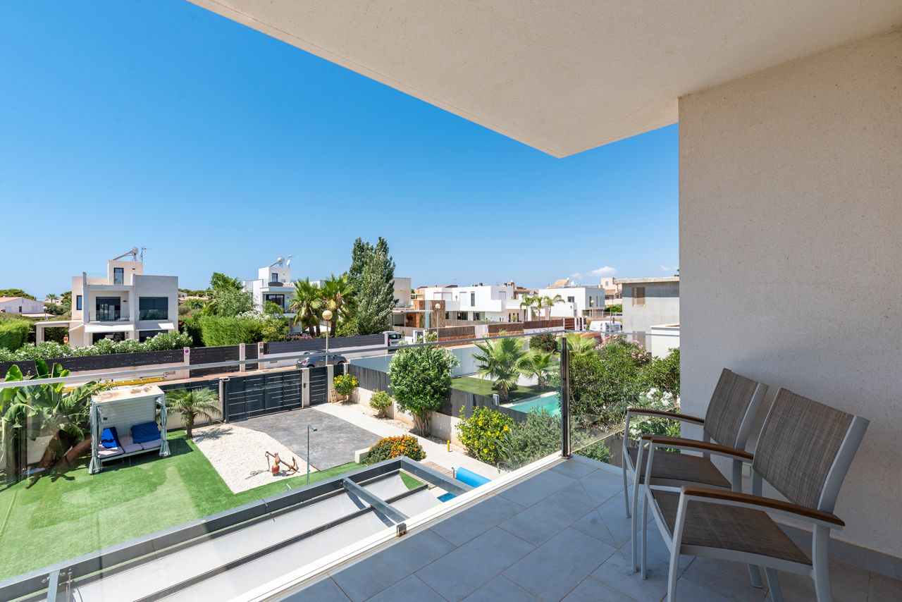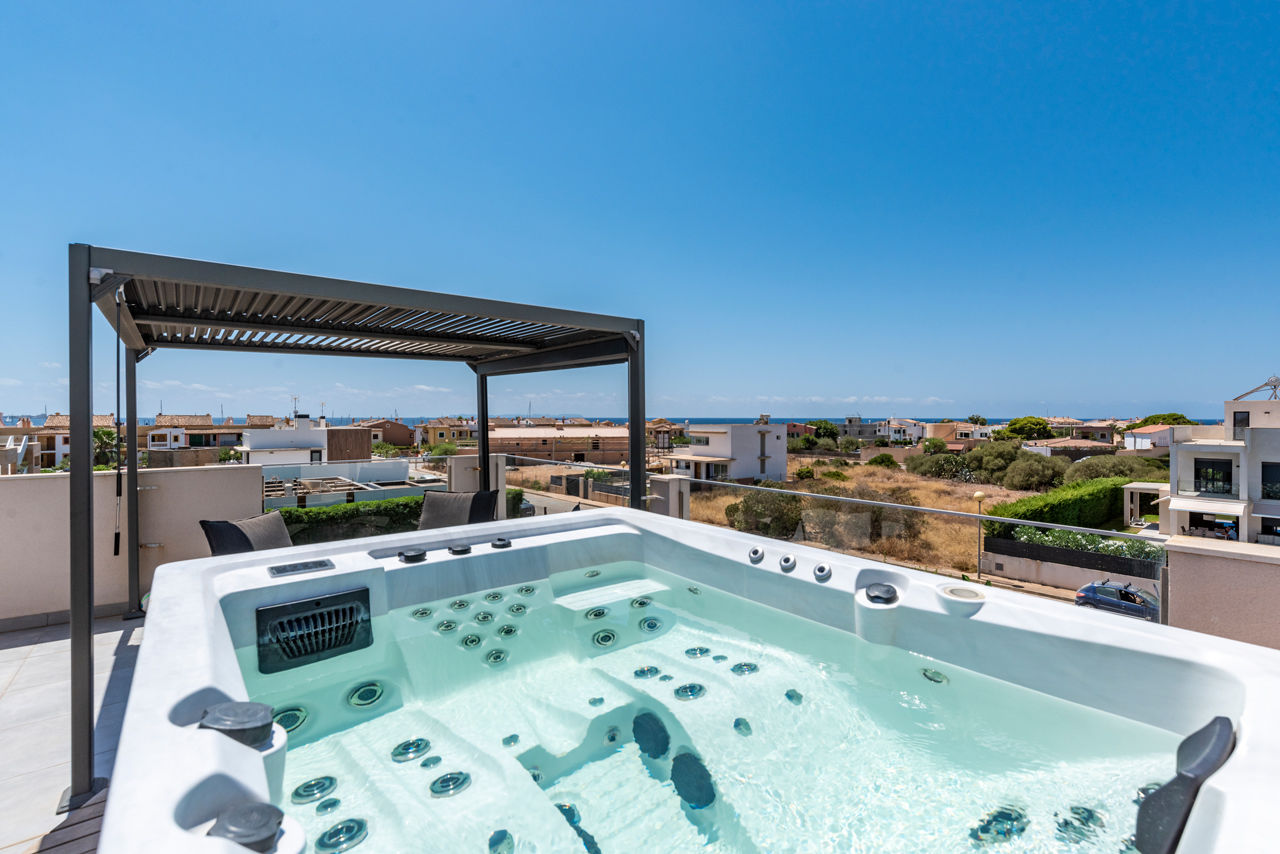 Diese tolle Villa mit privatem Pool und Meerblick in Sa Rapita befindet sich nur wenige Minuten vom berühmten Strand Es Trenc, der als einer der schönsten Strände Mallorcas bezeichnet wird. Die attraktive Immobilie mit Südausrichtung wurde 2018 fertiggebaut. Das Grundstück hat ca. 450 m2 und die bebaute Fläche beträgt ca. 156 m2, die sich folgendermassen aufteilen: Ein sonniges Wohn-/Esszimmer mit komplett ausgestatteter amerikanischer Küche, 4 komfortable Schlafzimmer mit Einbauschränken, 3 helle Badezimmer (1 davon ist en suite), ein Abstellraum sowie eine Waschküche. Der gemütliche Aussenbereich mit privatem Garten und grossem Pool ist ein idealer Ort um die sonnigen Tage zu geniessen. Weitere Merkmale sind Keramikböden, Klimaanlage warm/kalt, beheizter Pool, wartungsfreie ISO-Fenster. Das absolute Highlight ist die 70 m2 grosse Dachterasse mit Jacuzzi und traumhaftem Meerblick, wo man fantastische Sonnenuntergänge erlebt. Diese moderne Villa mit privatem Pool und Meerblick in Sa Rapita verfügt auch über 3 Parkplätze. Sa Rapita ist ein Ort zum Wohlfühlen an der Südküste Mallorcas. In der Nähe gibt es wunderschöne Strände mit kristallklarem Wasser wie Es Trenc, der auch durch die Salinen etwas Besonders ist. Der internationale Flughafen von Palma de Mallorca ist 35 Fahrminuten entfernt.